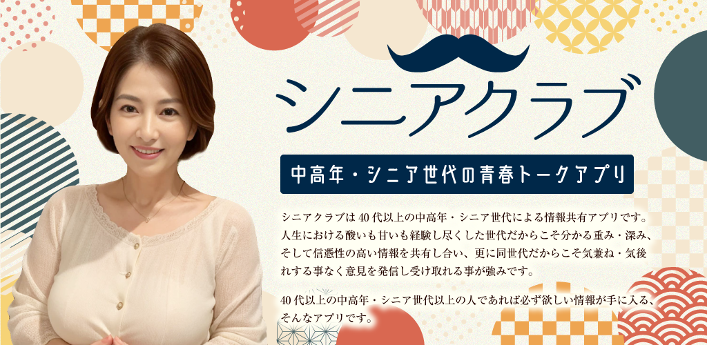シニアクラブは40代以上の中高年・シニア世代による情報共有アプリです。 色々な経験を積み重ね、人生における酸いも甘いも経験し尽くした世代だからこそ分かる重み・深み、そして信憑性の高い情報を共有し合い、更に同世代だからこそ気兼ね・気後れする事なく意見を発信し受け取れる事が一番の強みです。 40代以上の中高年・シニア世代以上の人であれば必ず欲しい情報が手に入る、そんなアプリにしていきたいと思っております。